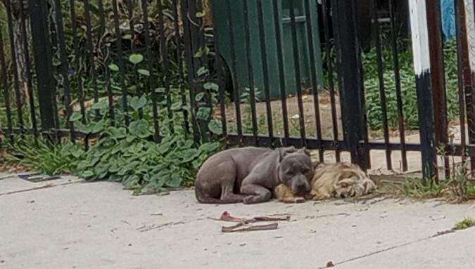 Abandoned Pit Bull snuggles with his Yorkie friend while waiting for someone to help them