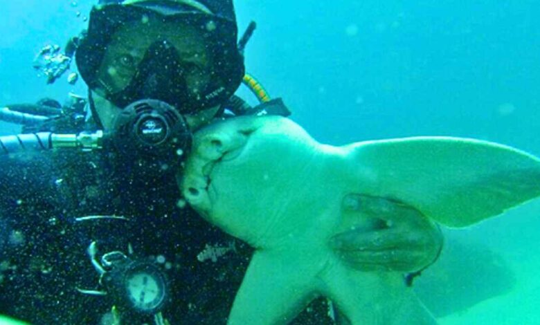 Shark swims up to Diver for a Cuddle every time she sees him