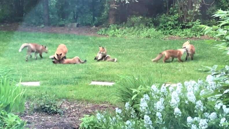 The fox family consists of a mom, dad and their five kids. They started dropping by just about every day to rest, relax — and, of course, to play.