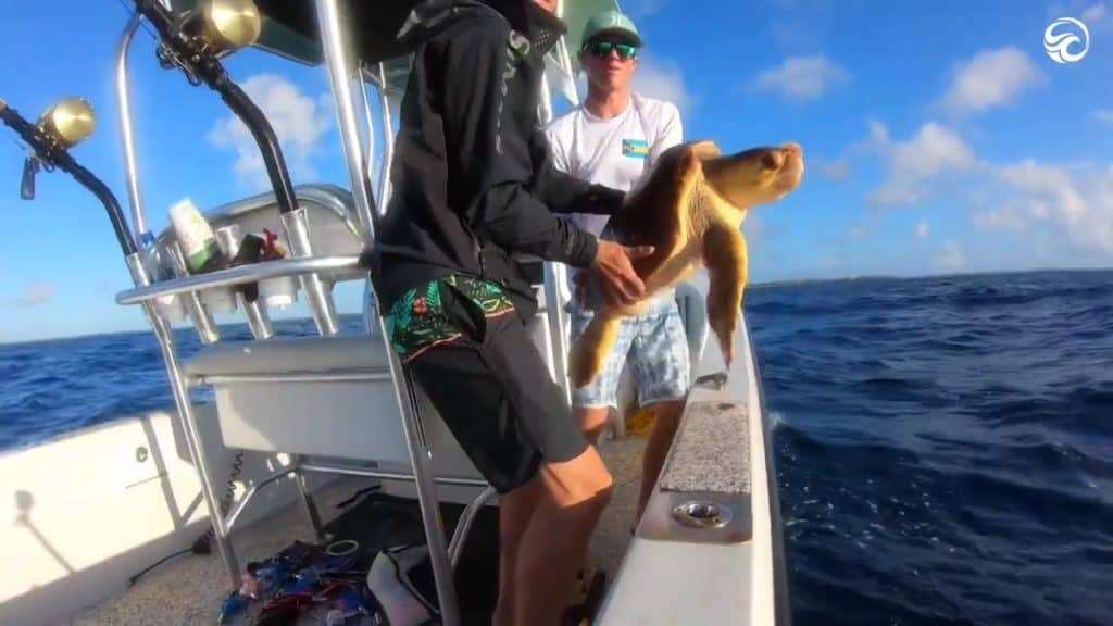 Kai Survance, from Green Turtle Cay, Bahamas, and his friend were sailing off the coast of Abaco when they came across the predator chasing the turtle in the water.