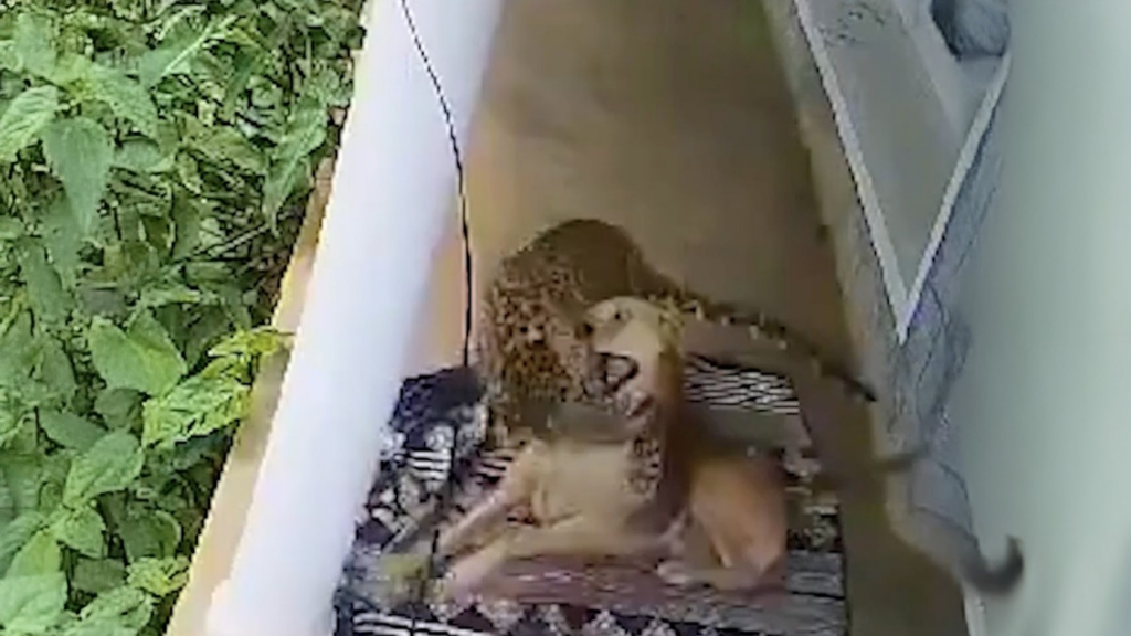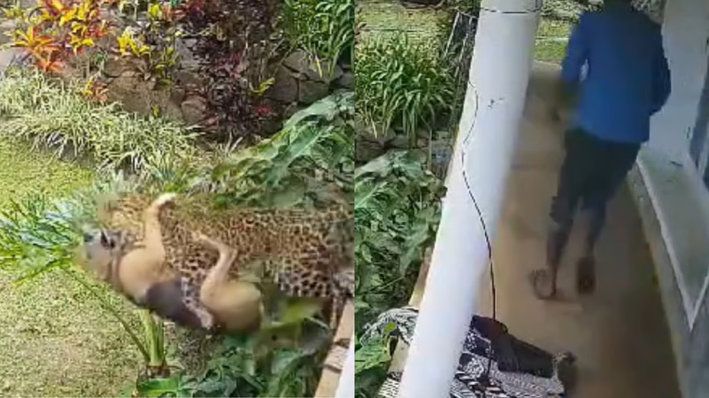 And as quickly as the leopard burst onto the scene, it was hastily attempting to drag the dog away from the house and into the wooded area it came from.