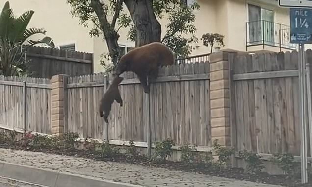 ‘Just another day in Monrovia, CA,’ Lissette captioned the video. The mama bear at one point sits atop the fence with half her body on one side and the other half attempting to pull the cub over.