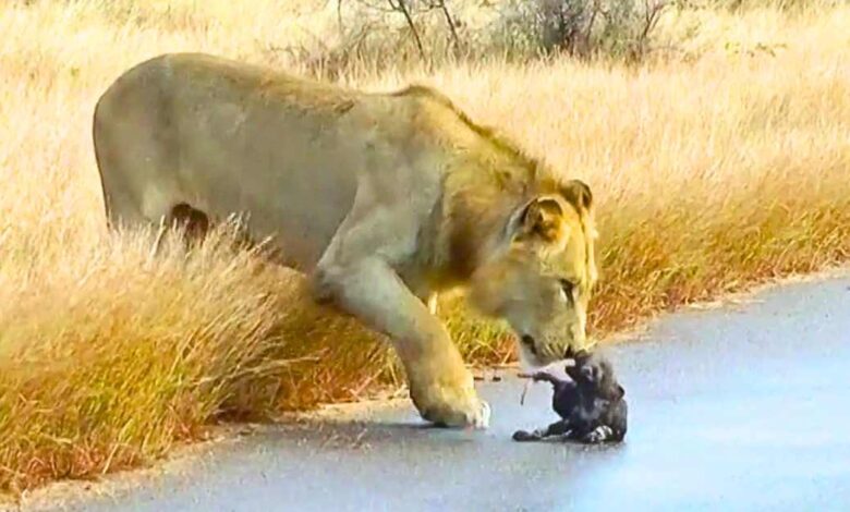 Lions find wild Dog Puppies Busy Moving Homes in the Road