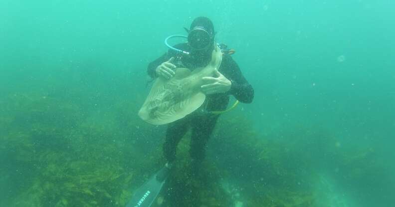 “I did this each time in the first season she was here,” he said. “Then over the following seasons, she’d recognize me and would swim up to me for a pat and cuddle. She soon got used to me — to the point where she will swim up to me when I’m going past, and tap me on the legs until I hold my arms out for her to lay on for a cuddle.”