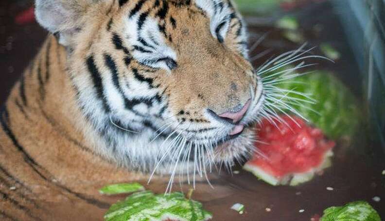 Under Keahey’s care, Aasha began to grow in size and, even though Keahey was unable to sit in Aasha’s enclosure with her now that she was bigger and healthier, she still loved to interact with the tigress through games like giving Aasha a good soaking with a hose.